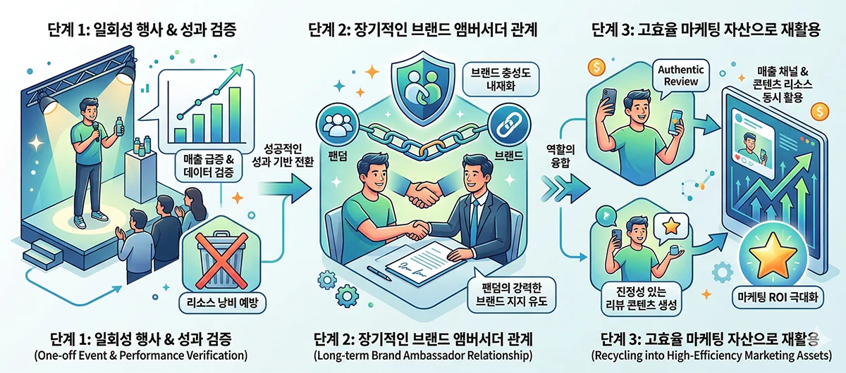 장기적인 브랜드 앰버서더 관계를 맺어 팬덤의 브랜드 충성도를 내재화해야 합니다.역할의 융합: 세일즈 파워를 가진 인플루언서의 진정성 있는 리뷰는