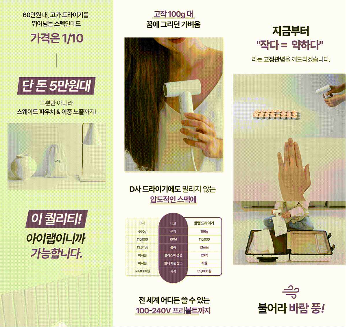 "집에서도 완벽하고, 여행 갈 때도 가볍게 챙겨가는 드라이기"라는 인식을 심어주었습니다.