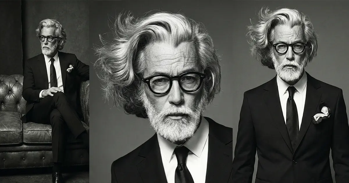 Subject: Middle-aged gentleman, classic suit, thick glasses, white beard